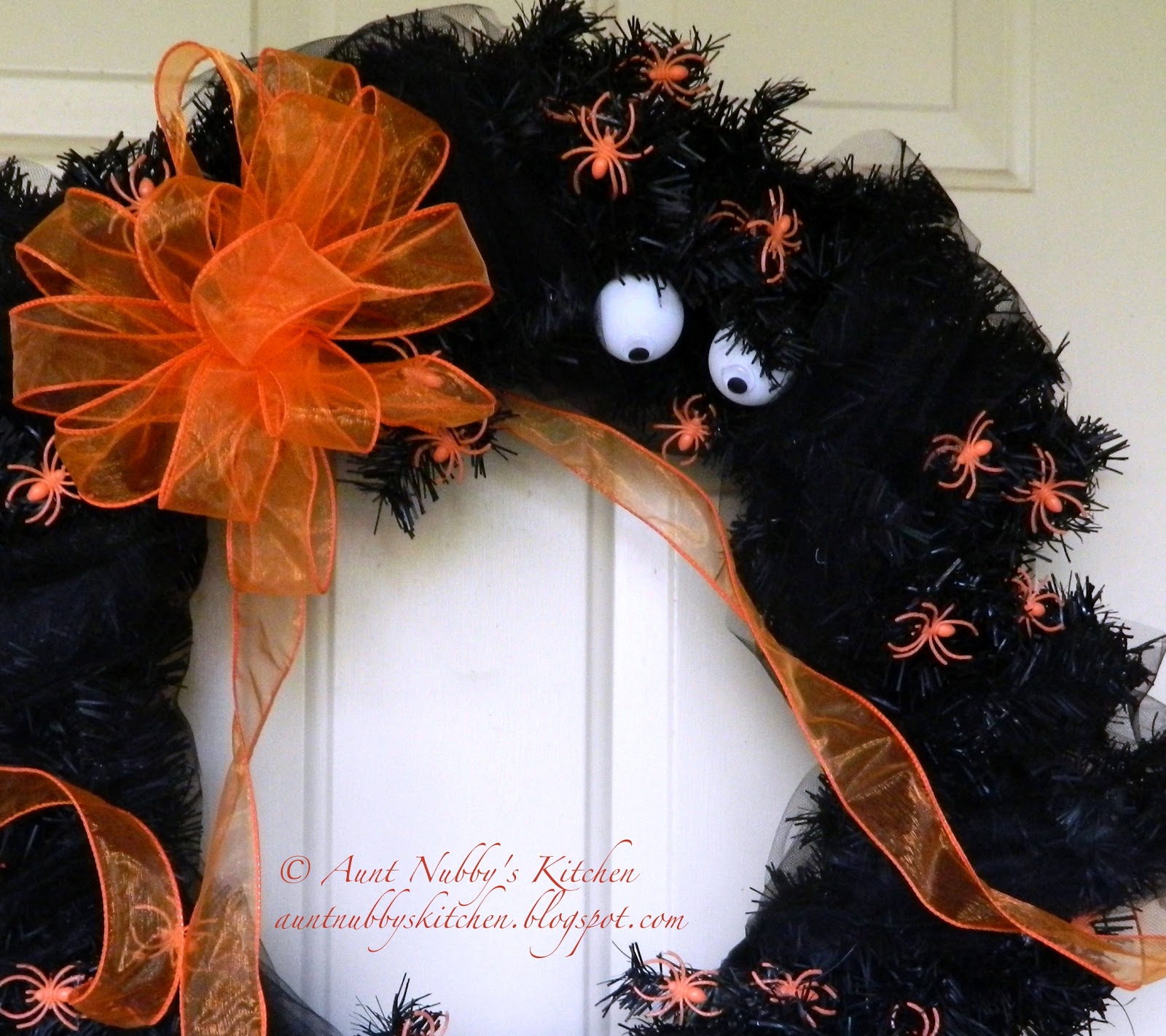 After the wreath was painted black and dried, I wrapped some black tulle around the wreath to give it a web-like effect. Then I simply hot glued the orange spiders all over the wreath for color and “creepiness”. Peeking eyes were made from the ping pong balls and wiggly eyes hot glued together. The wreath was finished with a big orange bow made from the wired ribbon and florist wire.