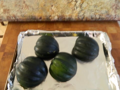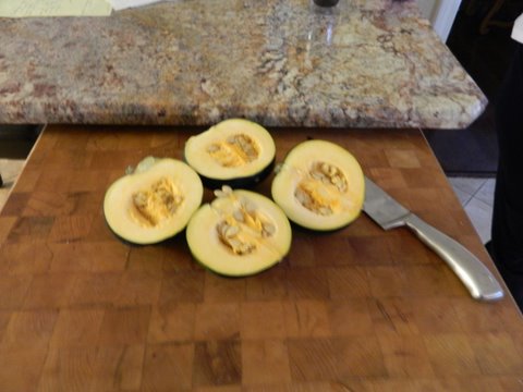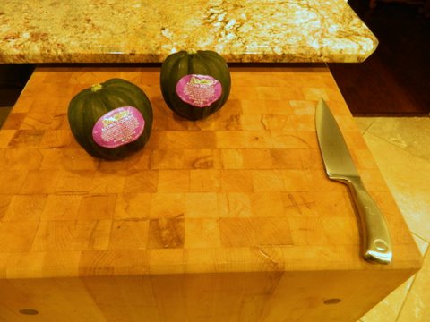 Start with two medium sized acorn squash. And by they way, they got their name because they look like acorns. These two are straight from the grocery store and still have their stickers on. I understand that acorn squash are easy to grow. That would be fun to try.