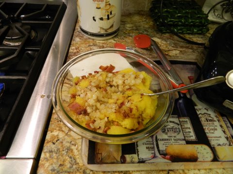 While squash is baking, prepare bacon, then saute chopped onion in bacon grease.