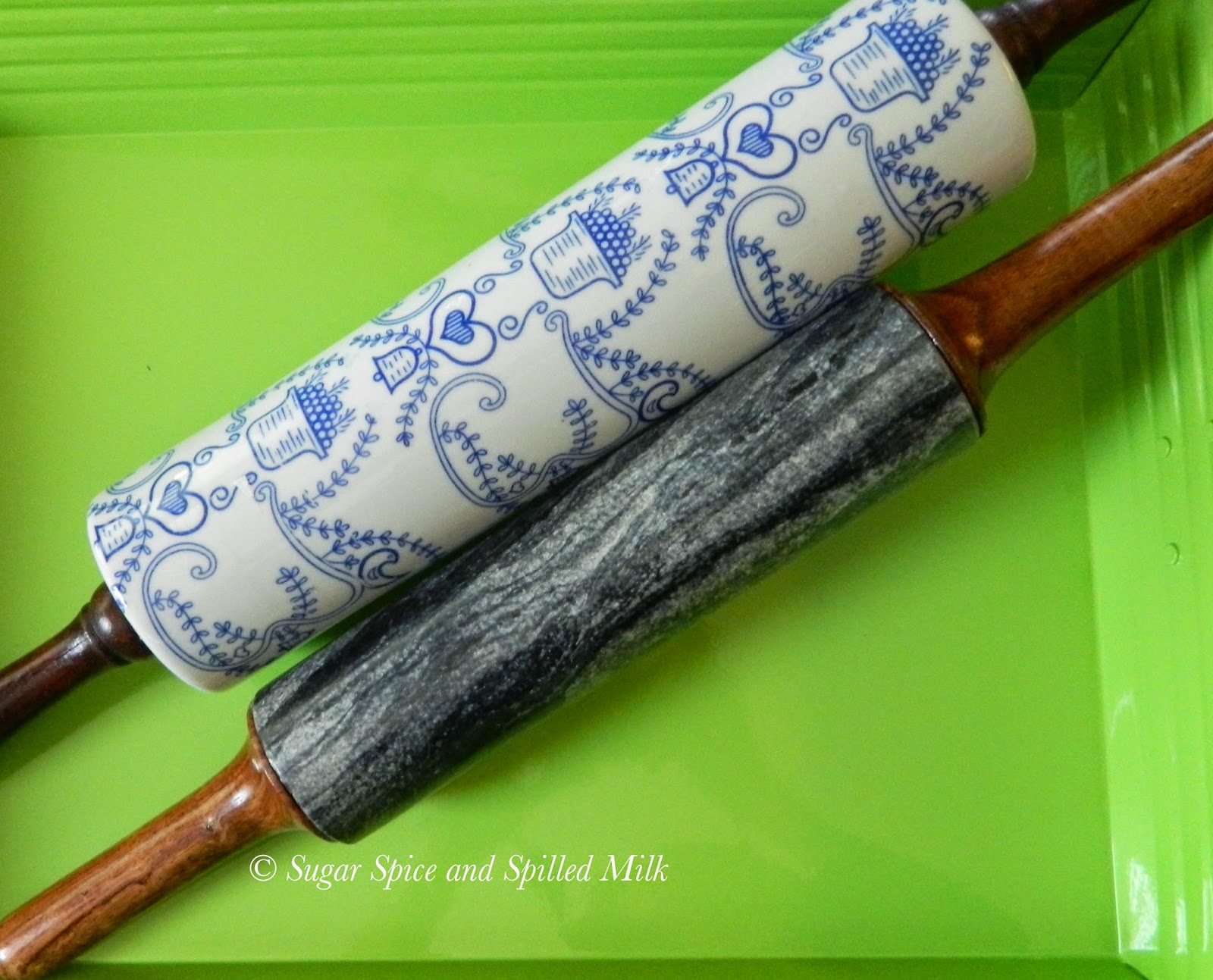 Rolling pins are manufactured in an assortment of materials. This blue and white pin is a roller type ceramic pin. The smaller gray pin is marble. The marble pin is an example of a rod type pin; the handles do not turn. For those who might consider using a rolling pin as a weapon, this marble one would be deadly. It may be small, but it is extremely heavy.