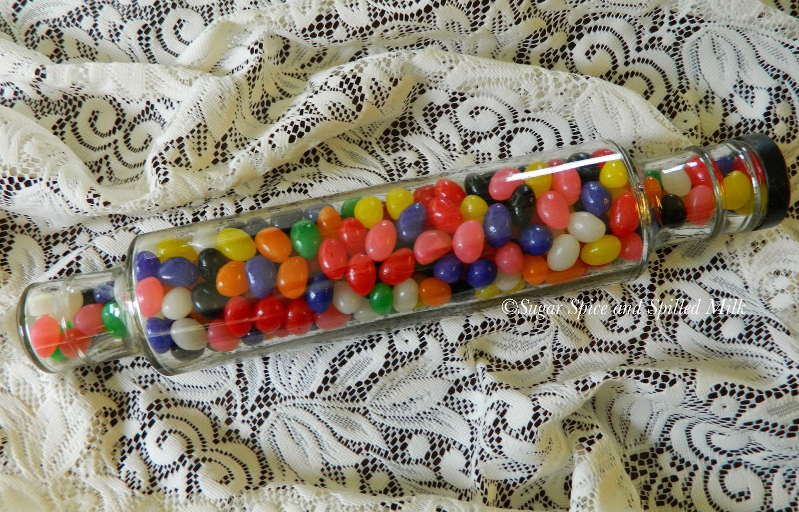 This glass rolling pin is an old one, and I understand it was designed to be filled with ice water before using. Because mine is not used for practical purposes I have filled it with jelly beans.