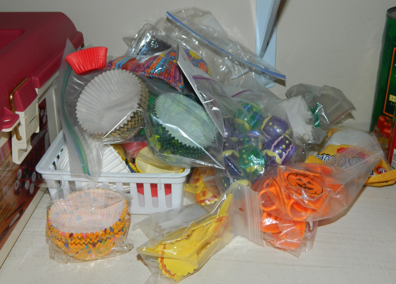 Many of my cake decorating supplies, such as tips, food coloring, and disposable frosting bags, are kept in a special case in my pantry. Those items stay organized with no problem, but some of my other cake supplies such as cupcake liners and decorative picks are kept in a small basket, and over time those items have become numerous and untidy.