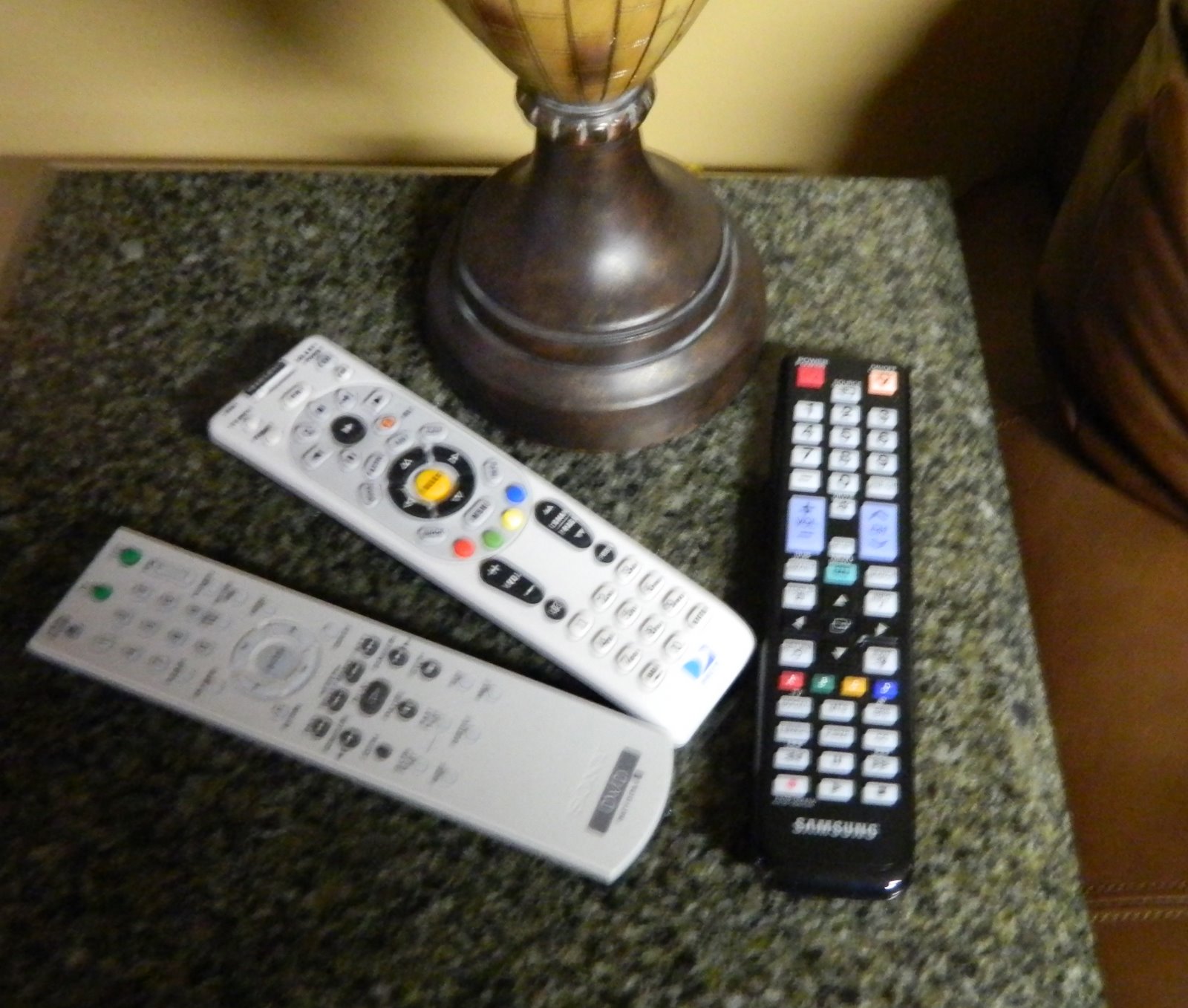 On a good day the remotes would all be on this little table beside the couch.
