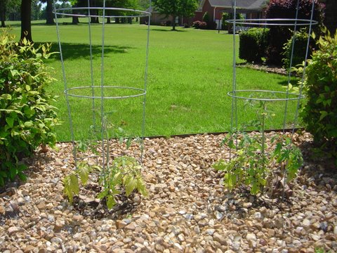 And last of all here are my sad, sad tomatoes. I set them out on April 7, during a short warm period, but it has been cold and raining almost ever since they were planted. They are blooming, but they are in dire need of sunshine.