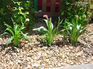 I bought some beautiful calla lilies. I’ve never tried growing them before. The tag said that they like morning sunlight, so I planted them on the East side of my house by the patio. I love all kinds of lilies, but these really caught my eye.