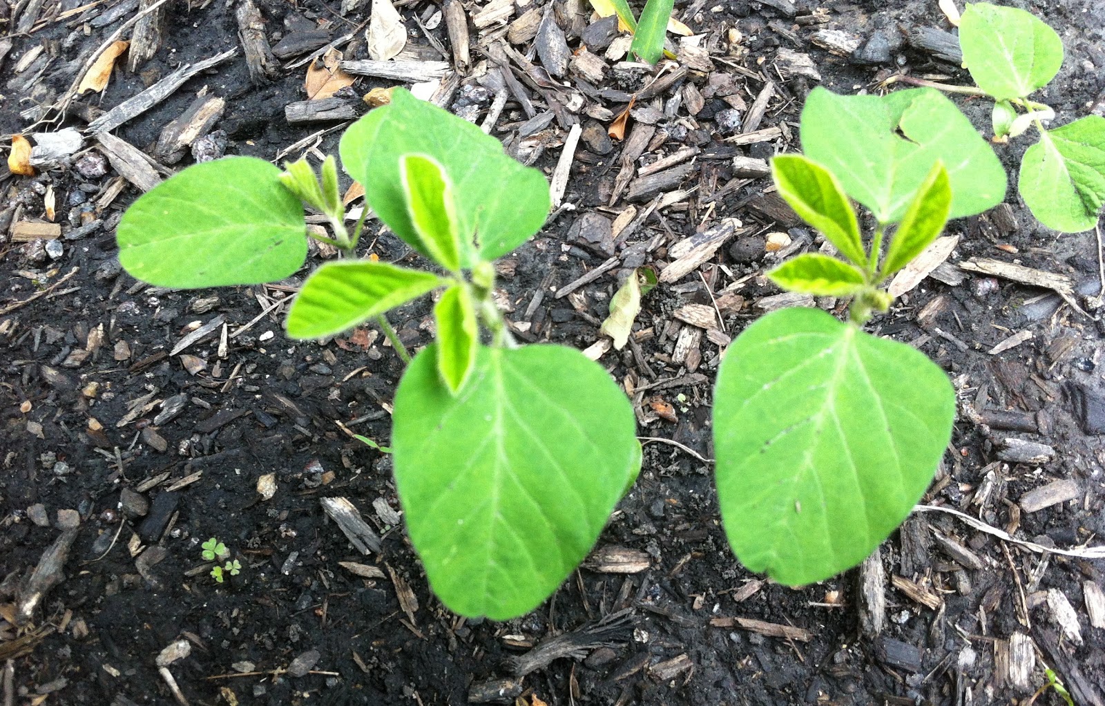 These soybean plants are two of five total that are currently growing in my flower bed. To my delight, they came up on their own this spring, or as my mother would say, they are “volunteer” plants. I brought 10 soybean seeds home last year from Bean2Blog, sprouted them and planted them in the flower bed. Apparently, some of the mature beans dropped off last fall and decided to grow this spring. With all the recent rains, I’m surprised the little seeds didn’t just wash away. I don’t really know how they managed it, but they grew, and they are quite sturdy little plants.