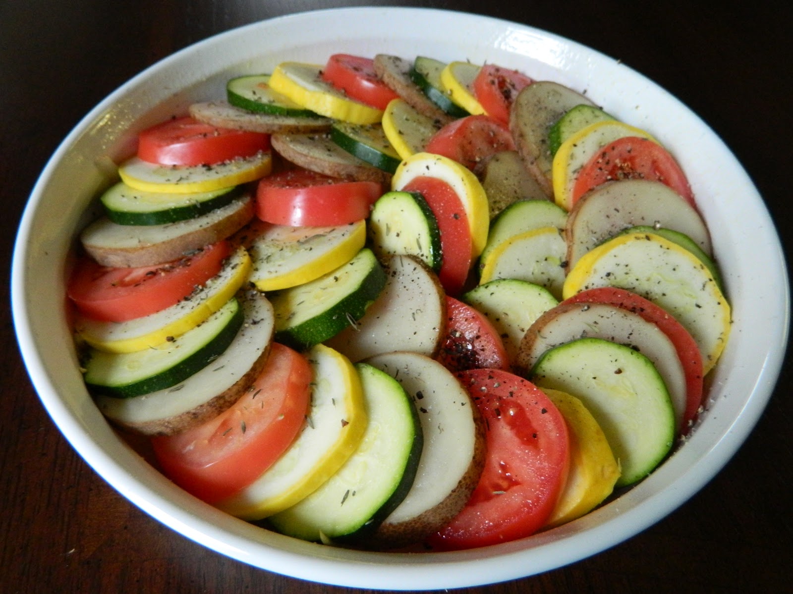 Slice the potatoes, zucchini, yellow squash, and tomatoes, then arrange the slices over the onions and garlic.