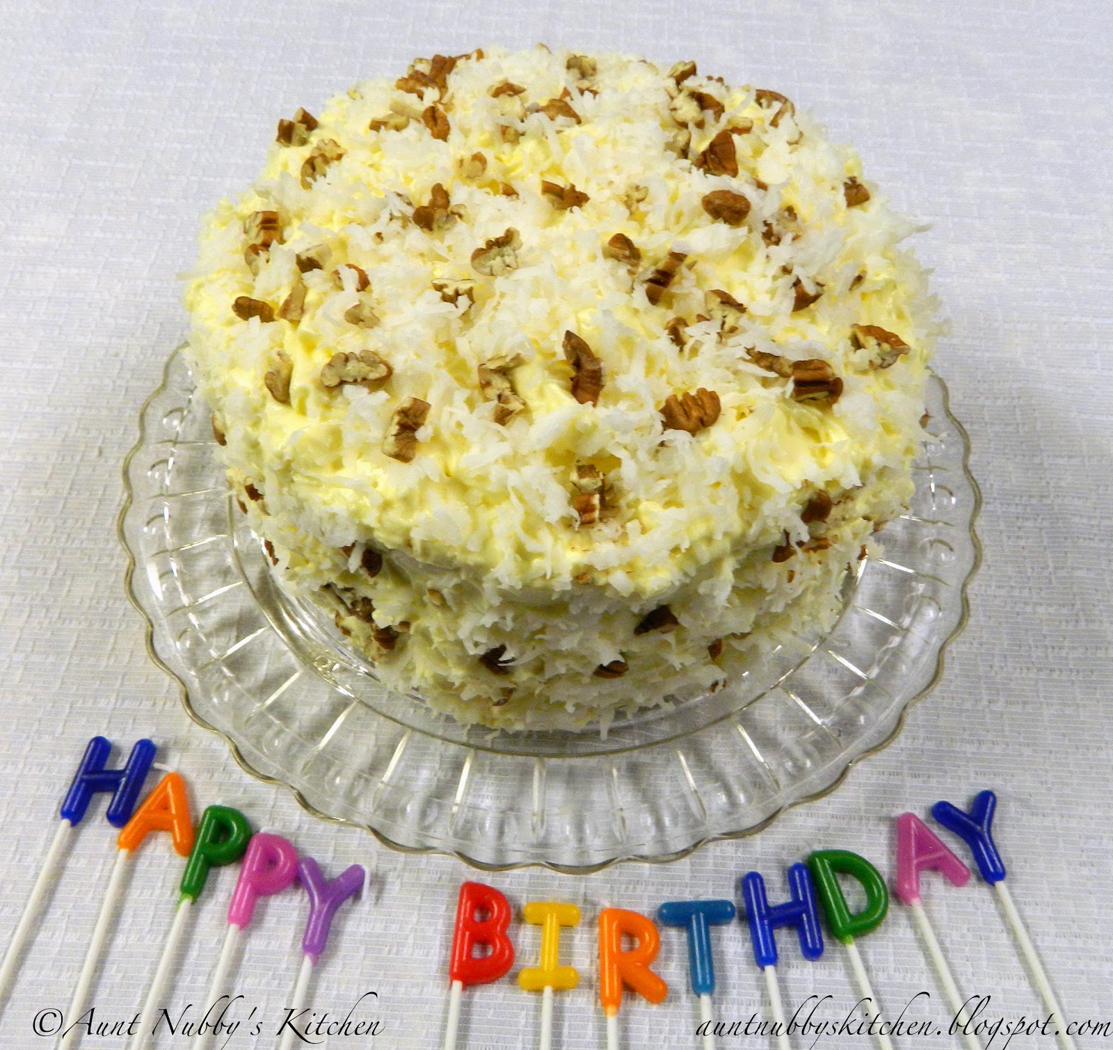 Wait until the cake has completely cooled before applying the frosting, then sprinkle with coconut and pecans.
