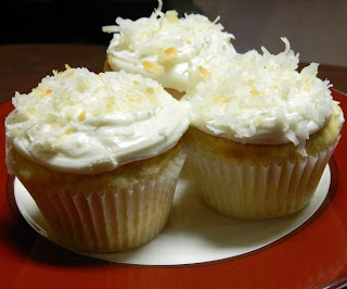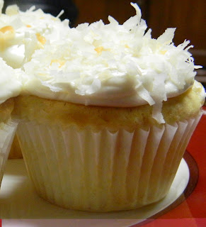 The cupcakes have white chocolate pudding mix added to the cake mix along with macadamia nuts. The frosting has white chocolate chips melted and blended into the white frosting. The cupcakes are then topped with toasted coconut.
